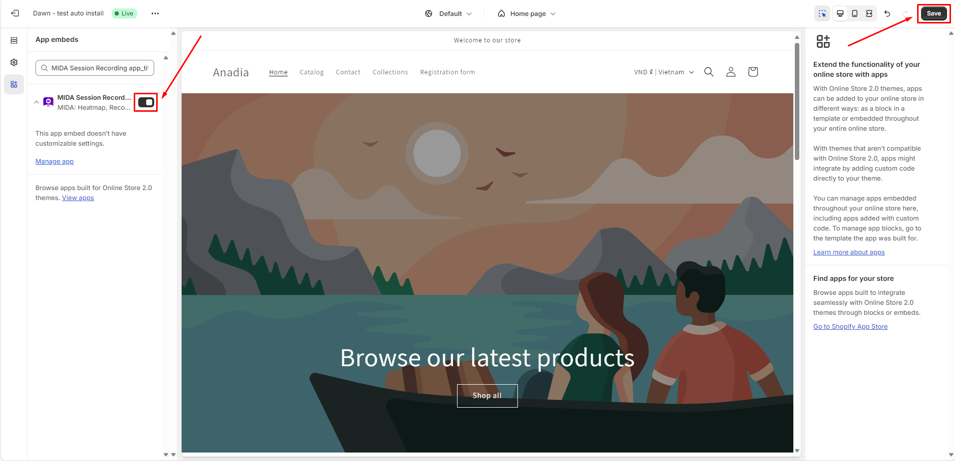 **Step 2:** Make sure that MIDA app embed is enabled and click "**Save"**.