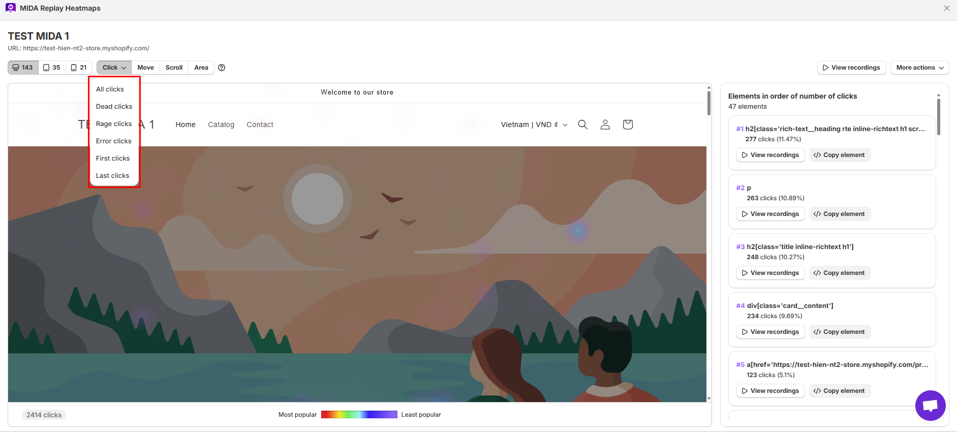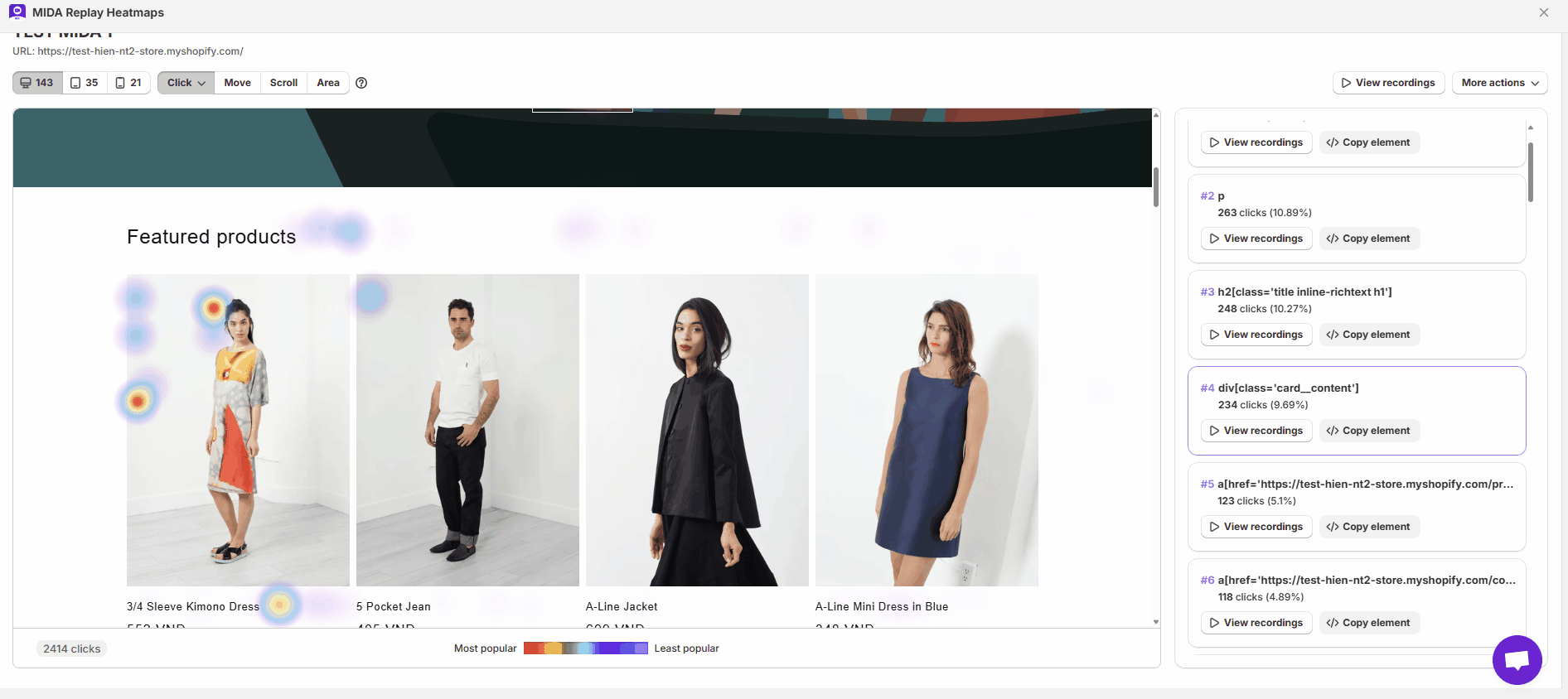 Touchpoints where user clicks are represented on the Heatmap. Change the click type to see different Click maps.