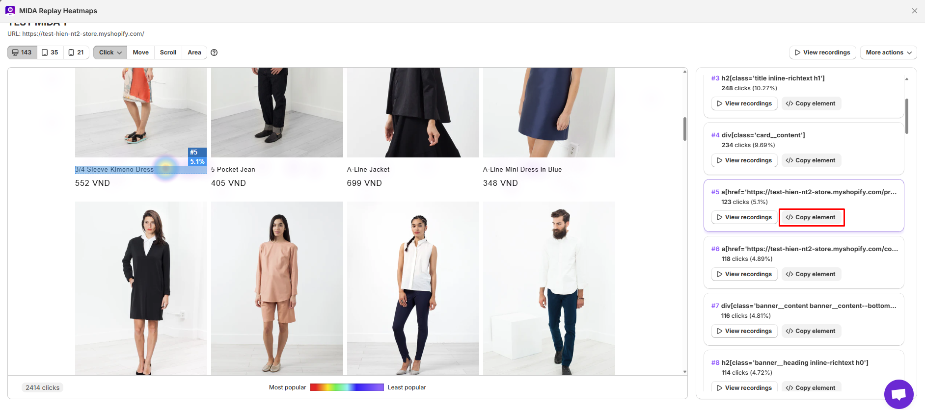 As you scroll to the bottom, you see elements ranked further down the page. Select any clicked element to view the number of clicks (% of clicks). Once you select an element on the Sidebar panel, it will automatically navigate you to that element on the Heatmap panel.