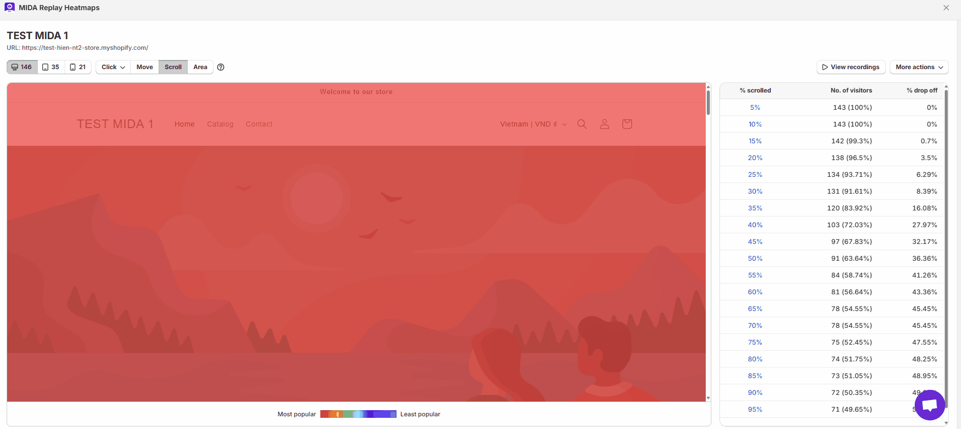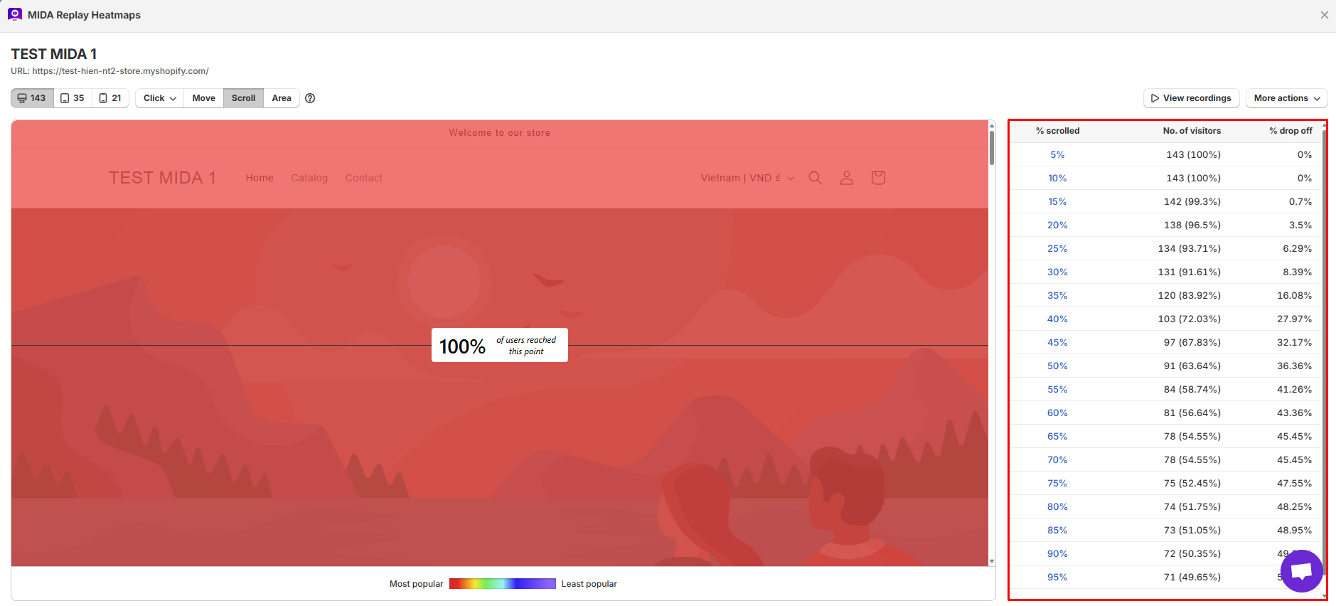 Scroll Heatmap helps you determine the ideal page length for maximum conversions and show how far your users scroll on the pages.